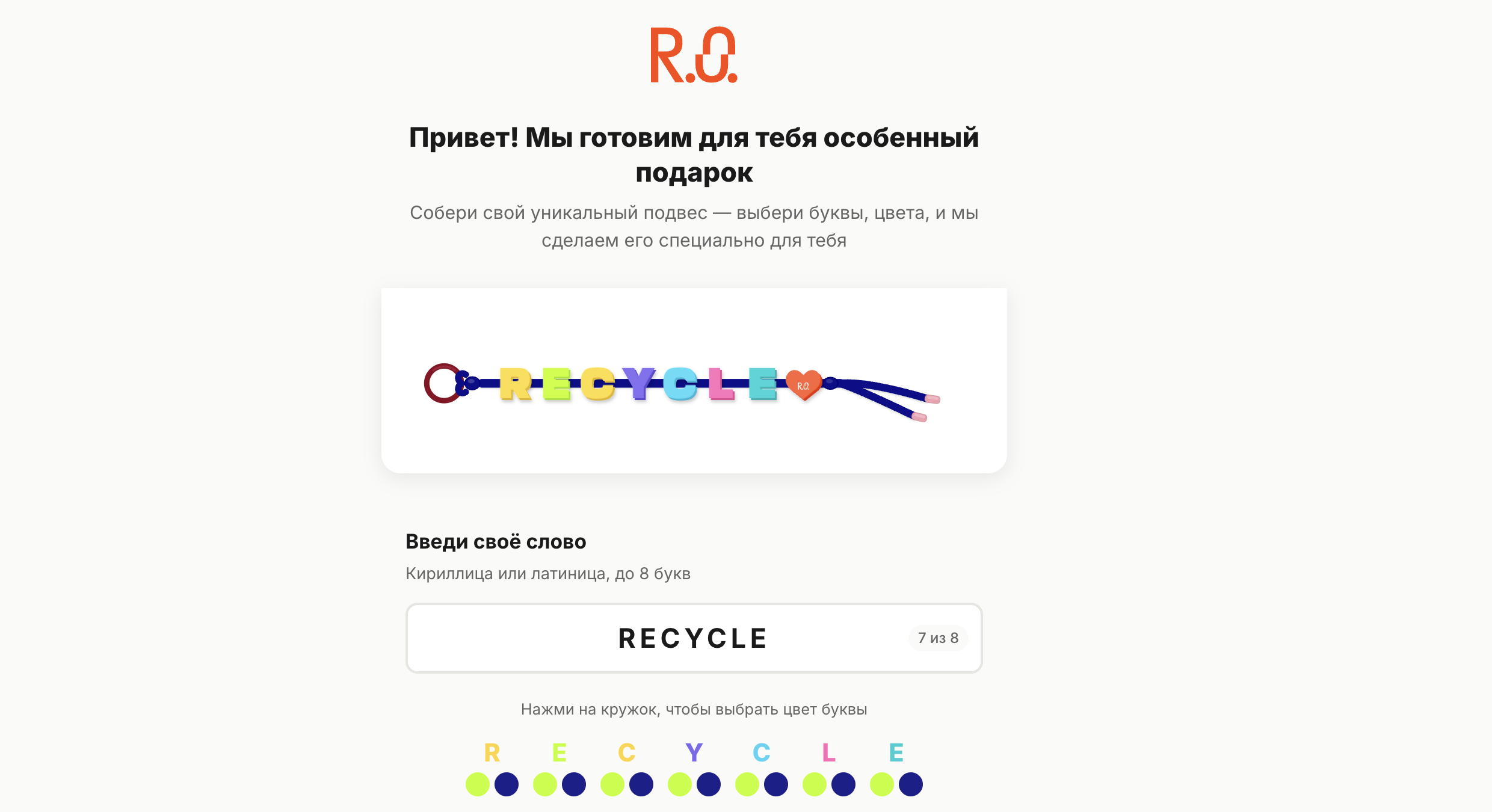 Именной подвес R.O. — каждый собирает свой: выбирает слово, цвета букв, шнур и карабин. Мы делаем и доставляем в офис в фирменной упаковке.