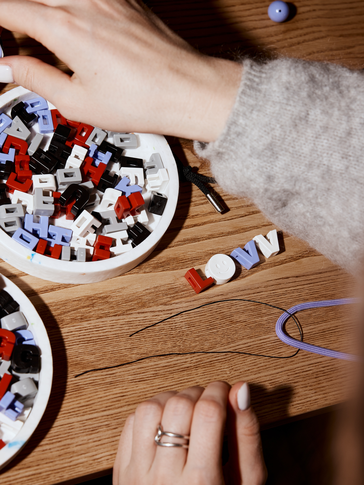 Буквы, шнуры, карабины, цветная фурнитура — всё на столе. Участник собирает объект вручную, как конструктор: без инструментов и спецнавыков.